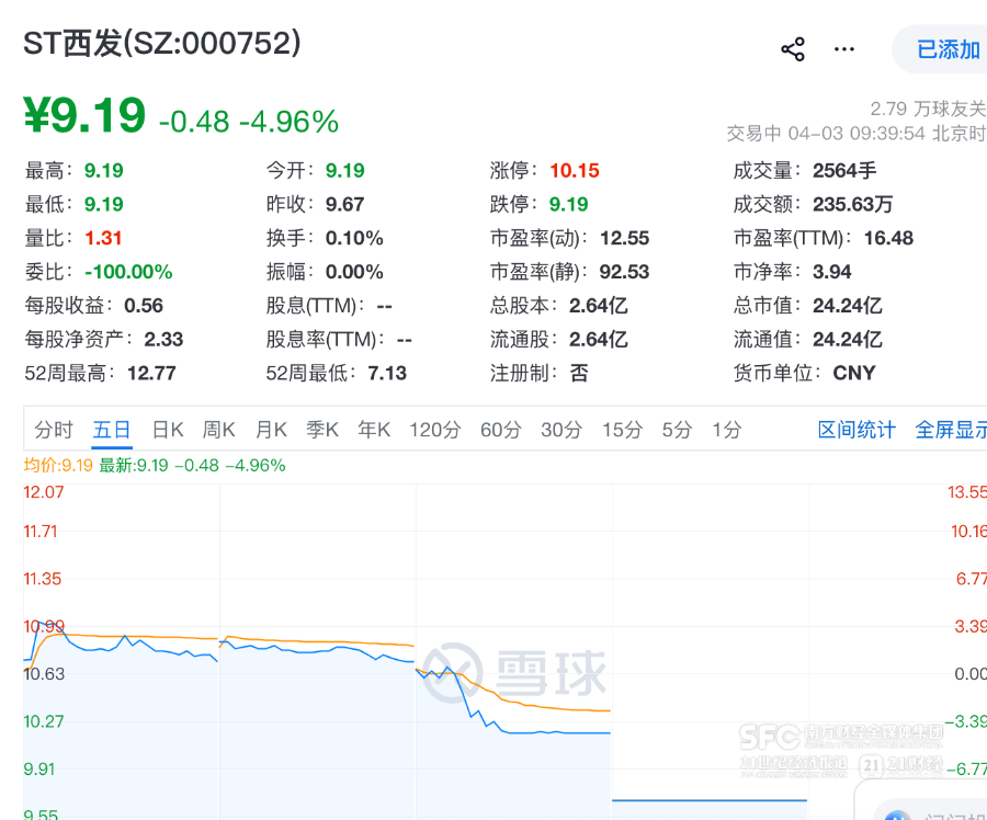 4月3日上午跌停后,ST西发股价为9.19元,相较于2023年预重整启动后的高点跌了近30%,市值蒸发近10亿元。