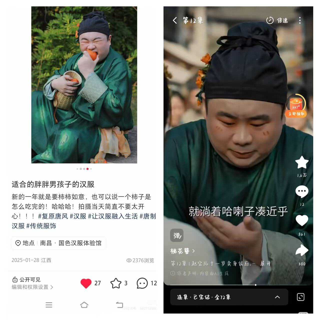 在身边朋友的提醒下,白菜和七海才发现剧中AI角色与自己撞脸了。“不仅脸一样,连身形、服装、妆造都和我去年发的一组照片几乎一模一样。”白菜说,作为汉服妆造师,这组照片只在微信朋友圈和小红书上宣传过。更让他难以接受的是,原本展现阳光、可爱的男孩形象,在剧中被塑造成见色眼开、贪财粗俗的“刘大”。