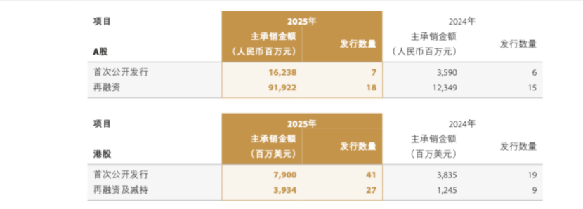 投行业绩大增背后,是这家以投行业务见长的券商在A股、港股各类业务上的全面开花。以A股IPO主承销金额为例,2024年为35.9亿元,2025年增至162.38亿元,2025年约为2024年的五倍;A股再融资增幅则更为夸张,2024年主承销金额为123.49亿元,2025年骤增至919.22亿元,2025年约为2024年的七倍。港股同比增幅不及A股,但同样显著,IPO主承销金额同比大增106%,再融资及减持同比增加216%。值得注意的是,中金公司港股股权承销金额常年位列中资券商第一,2024年以来持续位列港股各类投行之首,这也意味着其港股业务基数相对较大,如此高比例增长更为难得。