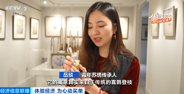 青年苏绣传承人 岳琰:2025年,首饰类的营收全渠道统计下来是超1000万元,2026年春节期间单枚胸针销量超7000枚,市场营收达到280万元。不仅是穿搭上面的点睛,对美好生活的期许,对于年轻人来说它更多的是一种情绪价值。