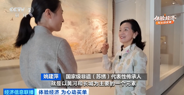 国家级非遗(苏绣)代表性传承人 姚建萍:这部作品名字叫锦绣河山,是以黄河和长城为主要元素,通过针法语言的松和紧、厚和薄,以及丝线材料的晕光,一针一线来表现出来它的虚和实,主次关系,前后关系,走动的过程当中,它的水是会动的。