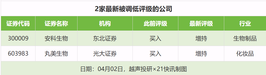 评级调低方面,4月2日,券商调低上市公司评级达到2家次,最新数据包括了东北证券对安科生物的评级从“买入”调低至“增持”,光大证券对丸美生物的评级从“买入”调低至“增持”。