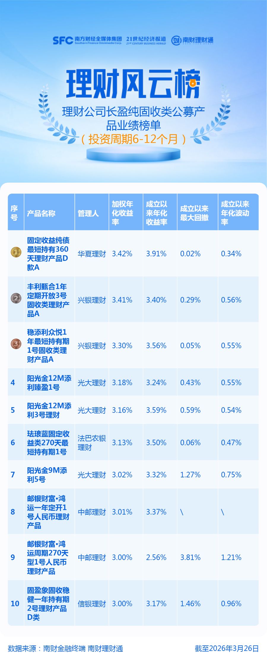 本期榜单统计对象为理财公司发行的成立满1年的公募纯固收产品,投资周期为6—12个月(含)期限,同系列同投资周期产品保留一只,加权年化收益率计算方式为“5%*近1月年化收益率+10%*近3月年化收益率+15%*近6月年化收益率+30%*近1年年化收益率+40%*成立以来年化收益率”,排名依据为加权年化收益率,数据计算截止时间为2026年3月26日。