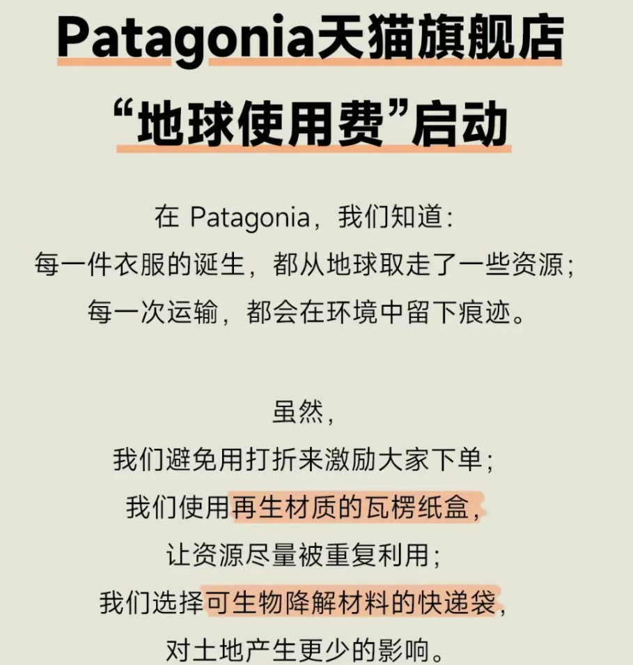 根据Patagonia天猫旗舰店发布的公告,品牌决定自今年4月起,向消费者收取一笔可退还的“地球使用费”。