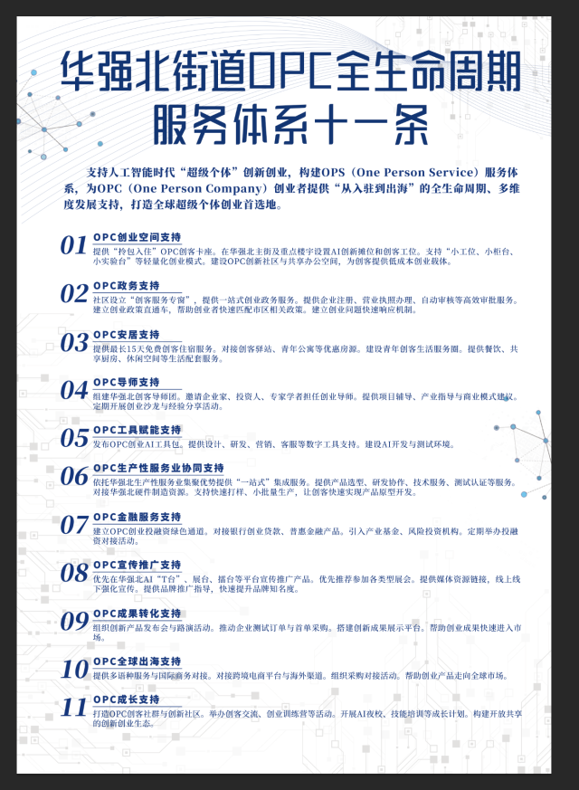 在政策服务维度,出台《华强北OPC创业11条》覆盖从入驻到出海的全生命周期,涵盖“拎包入住”创客卡座、15天免费住宿、AI工具包、生产性服务业协同、跨境电商及海外渠道对接等维度,同步配备优质创业导师与全流程孵化指导。从孵化到出海,从人才到宣传,华强北正以全覆盖、全链条的政策体系降低创业门槛,让每一位OPC创业者精准触达政策红利,让创业者“拎脑入驻、无忧出海”。