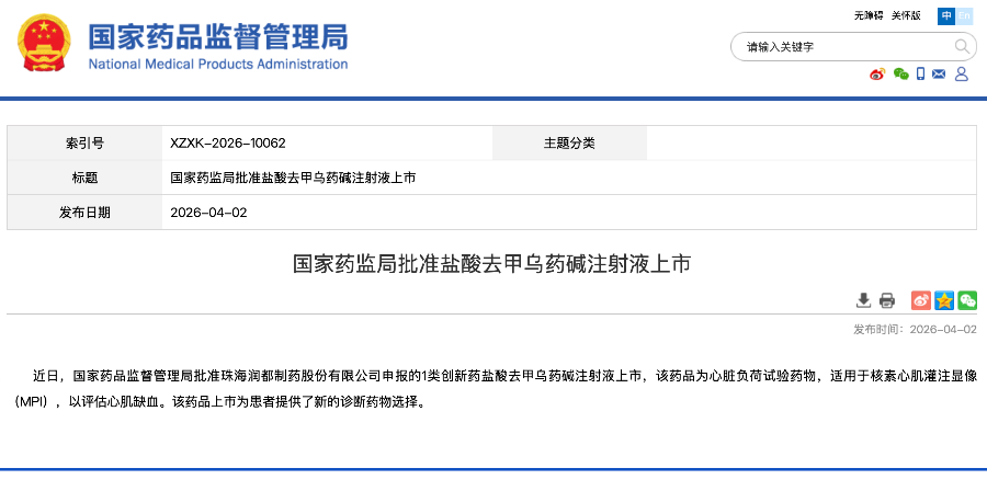 4月2日,国家药品监督管理局批准珠海润都制药股份有限公司申报的1类创新药盐酸去甲乌药碱注射液上市,该药品为心脏负荷试验药物,适用于核素心肌灌注显像(MPI),以评估心肌缺血。临床不良反应轻微,安全性良好。
