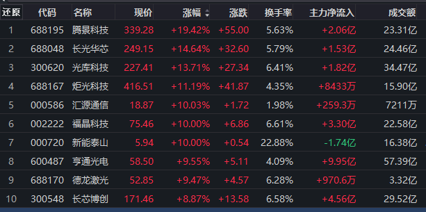 4月3日,光纤概念延续强势,腾景科技涨超19%,长光华芯、光库科技、炬光科技、汇源通信、福晶科技等跟涨。