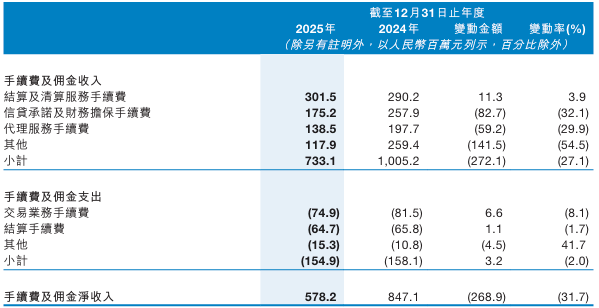 非利息收入方面,2025年,该行手续费及佣金净收入5.78亿元,同比下降31.7%。其中,信贷承诺及财务担保手续费同比下降32.91%至1.75亿元,代理服务手续费同比下降29.9%至1.39亿元,而结算及清算服务手续费同比增长3.9%至3.02亿元,成为该板块的亮点。