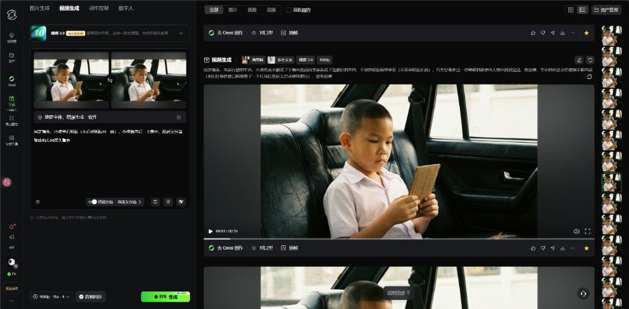 “最怕的是颜色不一致、人物脸变掉。但可灵在这一块表现非常好,衔接的位置几乎看不出问题。”杨选还在提示词中设计了窗外景色的变化,让观众在潜意识里感受到空间的移动和时间的流逝。“很多人可能没意识到,但就是这些细节让画面有了真实感。”