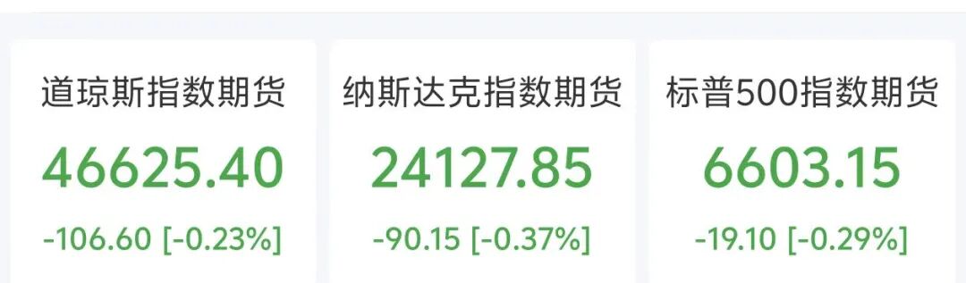 美股指期货全线下跌, 标普500股指期货最终跌0.29%,道指期货跌0.23%,纳斯达克100股指期货跌0.37%。