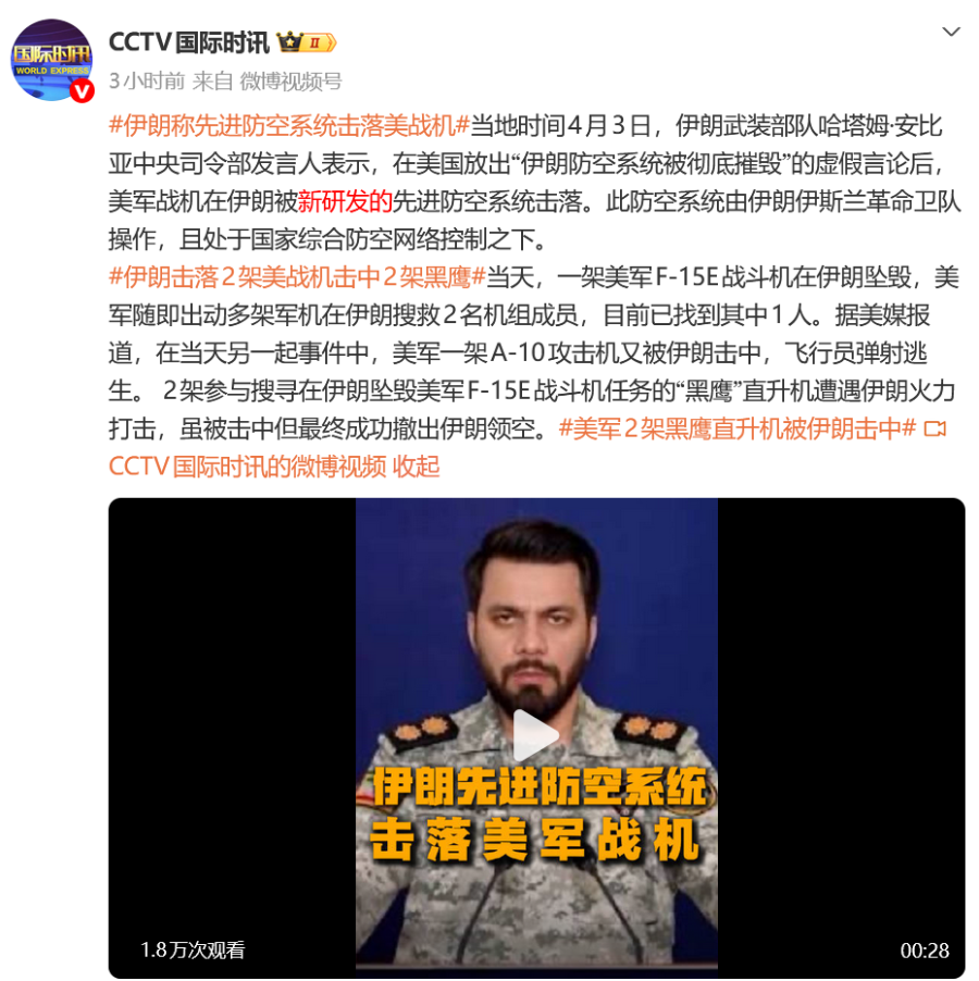 据CCTV国际时讯, 当地时间4月3日,伊朗武装部队哈塔姆·安比亚中央司令部发言人表示,在美国放出“伊朗防空系统被彻底摧毁”的虚假言论后, 美军战机在伊朗被新研发的先进防空系统击落。此防空系统由伊朗伊斯兰革命卫队操作,且处于国家综合防空网络控制之下。