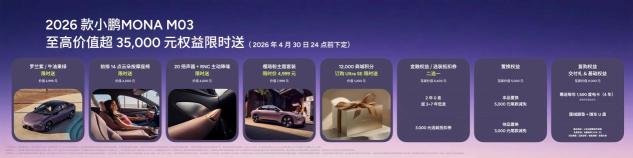 4月2日,2026款小鹏MONA M03正式上市。作为小鹏面向年轻用户打造的AI智能纯电轿跑,新车以“全方位对标20万级车型”为开发基准,在外观设计、智能科技、驾乘舒适与主被动安全等核心维度实现全面进化,致力于为年轻用户带来越级出众的用车体验。本次上市共推出6款版型,官方指导售价依次为:540长续航Plus 11.98万元、640超长续航Plus 12.98万元、510长续航Max 12.98万元、610超长续航Max 13.98万元、510长续航Ultra SE 14.18万元及610超长续航Ultra SE 15.18万元。品牌同步推出上市专属权益,即日起至2026年4月30日24点前下定2026款小鹏MONA M03,限时送至高价值超35,000元权益。