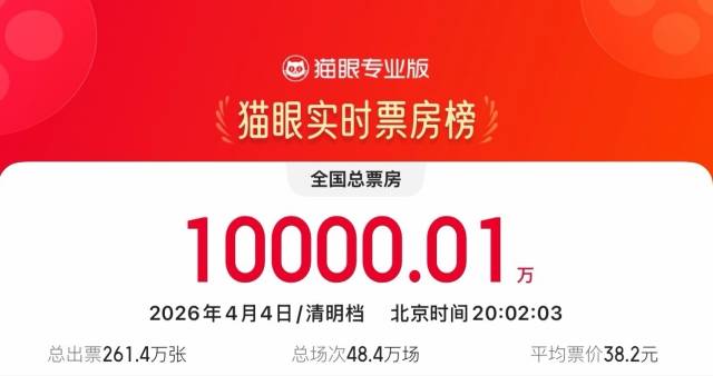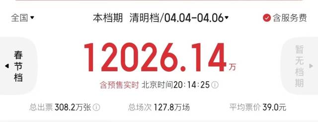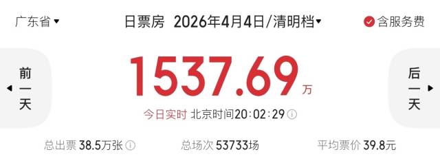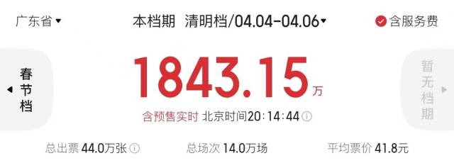 与此同时,2026年清明档(4月4日—6日)总票房(含预售)突破1.2亿元,总观影人次超308万,总放映场次达127.8万。广东省清明档总票房已超1800万元,稳居全国“第一票仓”。