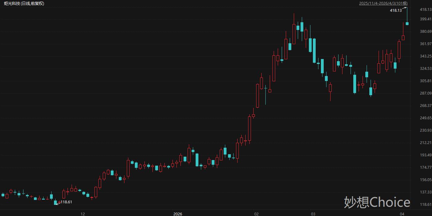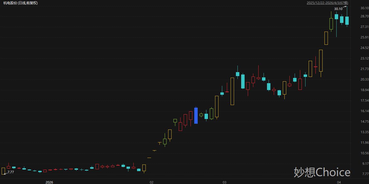 主营包括光纤预制棒、光纤等产品的杭电股份周五盘中一度触及30.10元/股,刷新历史新高。拉长时间来看,杭电股份股价自1月低点迄今累计最大涨幅280%。值得注意的是,杭电股份3月30日公告称,自2026年1月30日至3月30日,公司股票交易4次触及股票交易异常波动情形。公司已累计发布4次异常波动公告及2次交易风险提示公告,持续向市场提示股票交易风险。