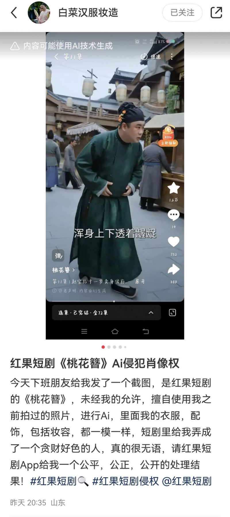3月30日,白菜收到了好友发来的截图,说一部AI短剧中有一个角色跟他长得几乎一模一样。白菜发现,这部AI短剧《桃花簪》里有一个叫“刘大”的角色,无论是五官、造型还是妆容,都与自己去年1月发布的一组唐风汉服写真高度相似。