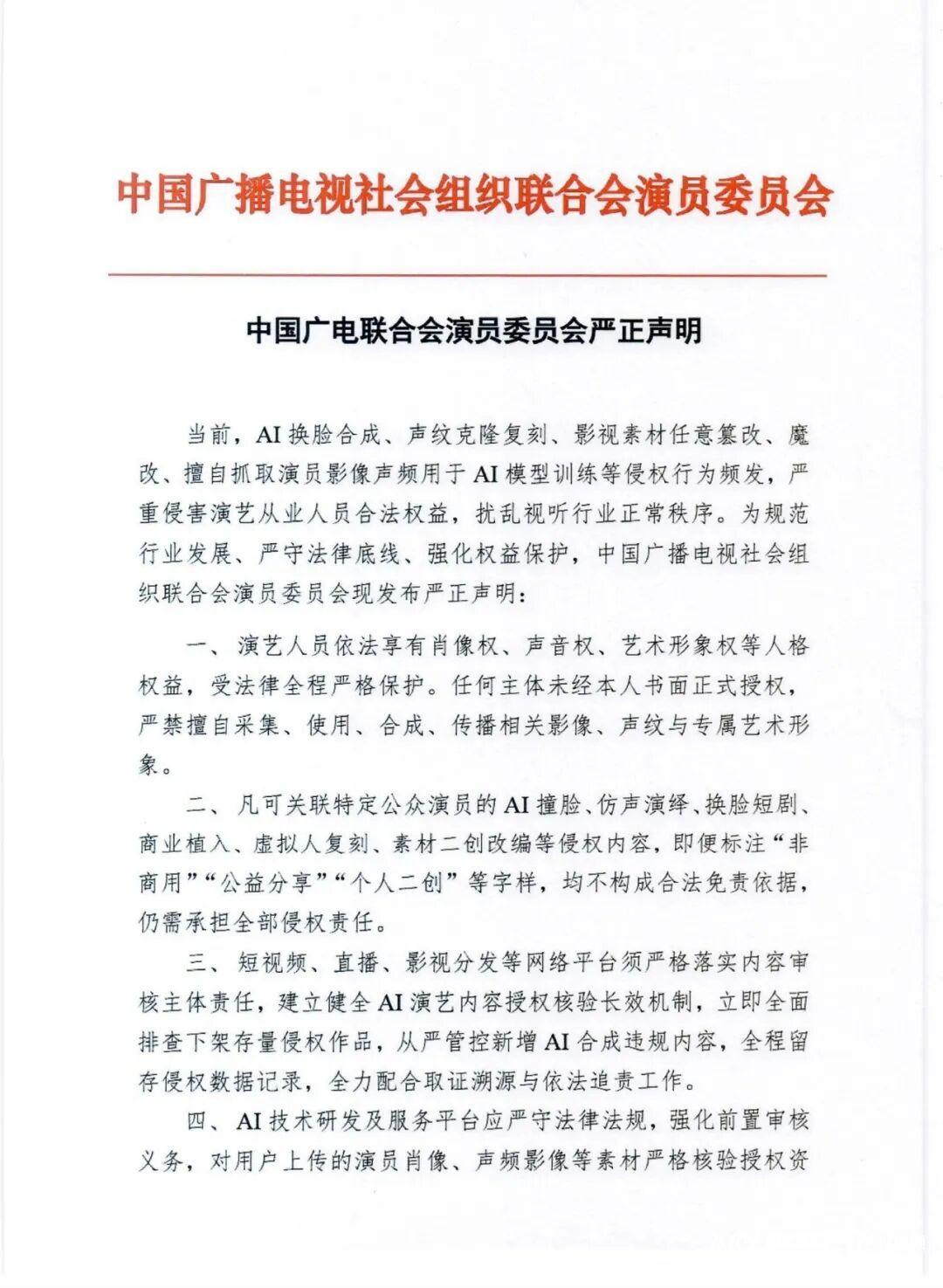 中国广播电视社会组织联合会演员委员会声明。