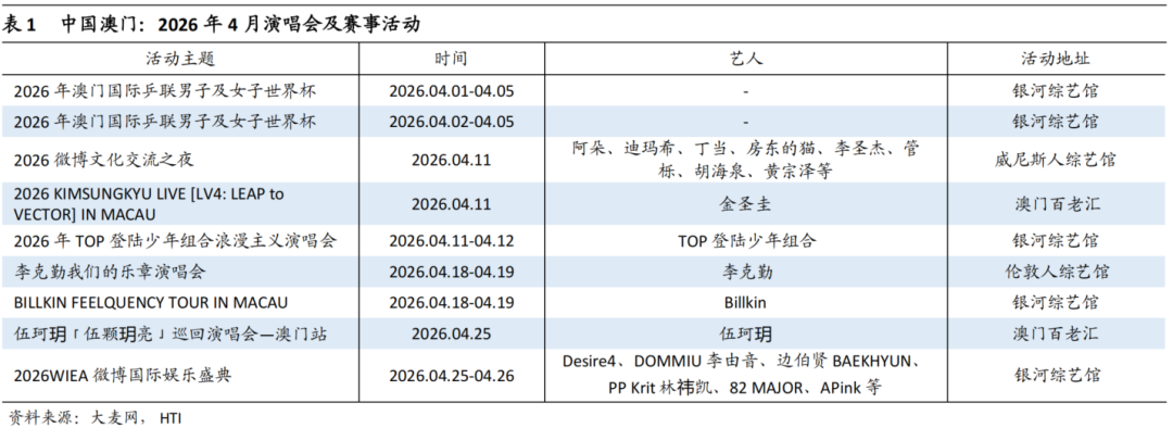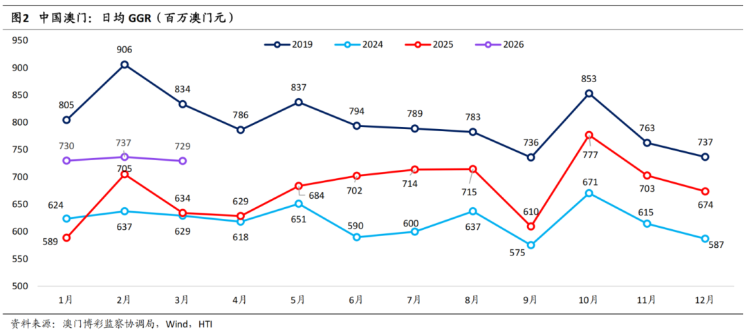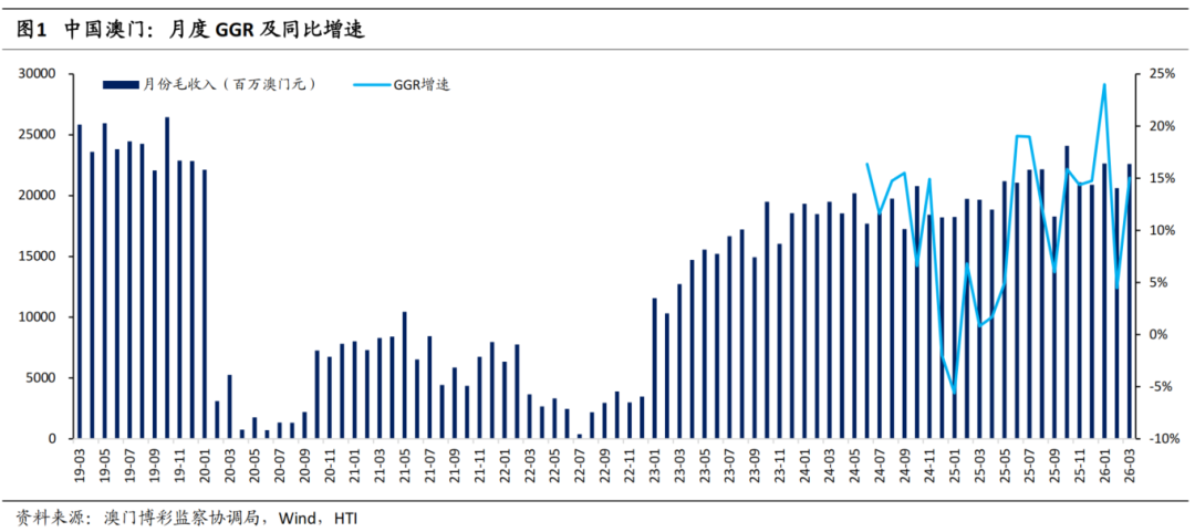 澳门博彩监察协调局发布幸运博彩3月数据:澳门幸运博彩毛收入(GGR)同比增长15%,恢复至2019年同期水平的87.5%,高于市场预期。2026年3月,澳门博彩毛收入达226.12亿澳门元,同比增长15%,环比增长9.6%,恢复至2019年同期水平的87.5%。3月澳门日均GGR为7.29亿澳门元,较2月的7.37亿澳门元下滑1%。3月为传统的淡季,在经历2月春节的疲软表现后,行业GGR增速仍实现韧性增长,高于我们对行业的增速预测。26Q1行业GGR同比增长14.3%,恢复至2019年同期的86.5%。我们预计4月的行业GGR将实现约12%的增长,恢复至2019年的89.5%。