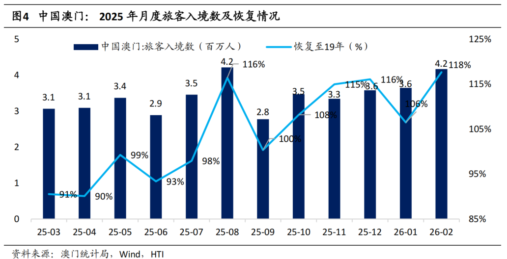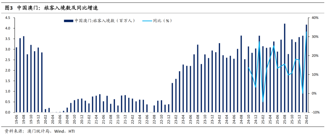 2月澳门旅客入境数同比增长32.6%,恢复至2019年同期水平的118%。根据澳门统计局数据,2026年2月,澳门旅客入境数为417万人,同比增长32.6%,环比增长14.4%,恢复至2019年同期水平的117.7%。其中,中国大陆旅客入境数为329万人,同比增长43.6%,环比增长21.7%,恢复至2019年同期水平的128.6%,占比为78.9%,不过夜旅客数占比为64.1%。2026年1-2月,澳门旅客入境数为782万人,同比增长15.1%,恢复至2019年同期水平的112.2%。其中,中国大陆旅客数占比为76.7%,不过夜旅客数占比为63.1%。