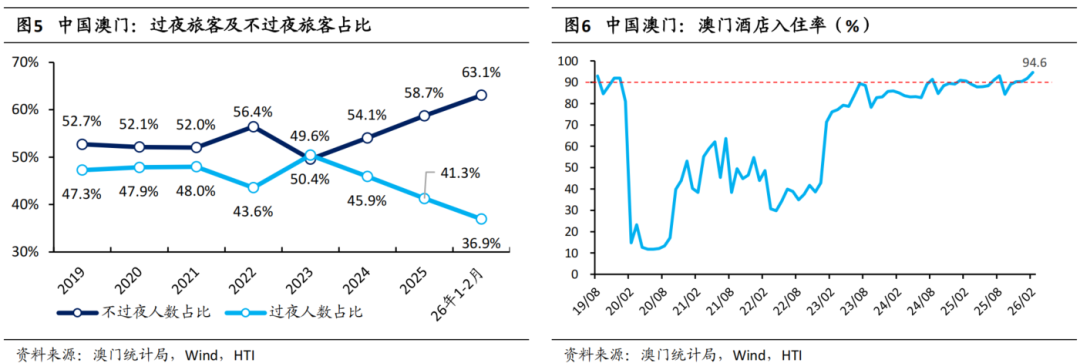2月澳门酒店入住率为94.6%,同比环比均有所提升,较2019年同期提升2.7个百分点。根据澳门统计局数据,2026年2月,澳门的酒店入住率为94.6%,同比提升4.0个百分点,环比提升2.8个百分点,较2019年同期提升2.7个百分点。2026年1-2月,澳门的酒店平均入住率为93.2%,同比提升2.5个百分点,较2019年同期提升0.8个百分点。2026年2月,酒店住客平均停留时间为1.6晚,同比环比均保持稳定。