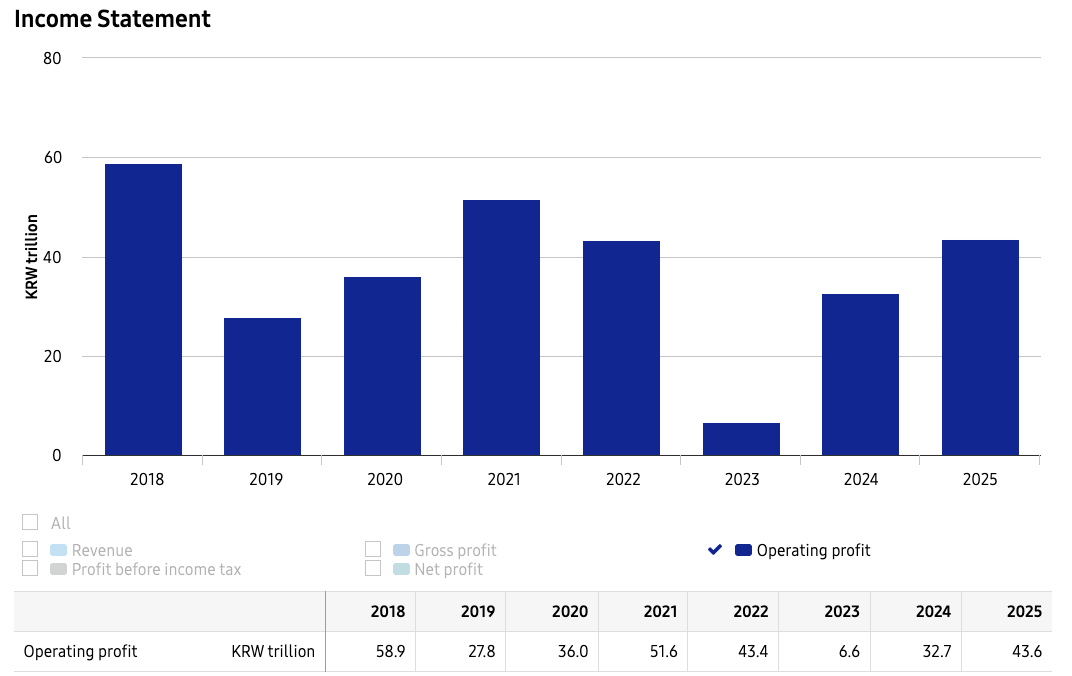 相比之下,这家全球最大内存芯片生产商去年总共录得43.6万亿韩元的营业利润,位居该公司历史第四高,仅次于2018年(58.89万亿韩元)、2017年(53.65万亿韩元)和2021年(51.63万亿韩元)。