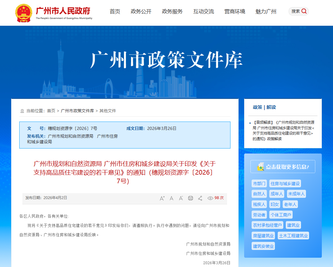 近日,广州市规划和自然资源局、广州市住房和城乡建设局联合印发 《关于支持高品质住宅建设的若干意见》 (以下简称《若干意见》), 以28条硬核措施构建覆盖“好城区、好社区、好房子、好市场”的全流程政策体系 ,全面落实国家“好房子”建设工作部署,以城市居住环境和住房品质提升推动住房供给侧结构性改革,有序推动安全、舒适、绿色、智慧的“好房子”建设,加快构建房地产发展新模式,满足人民群众日益增长的多样化居住生活需求。