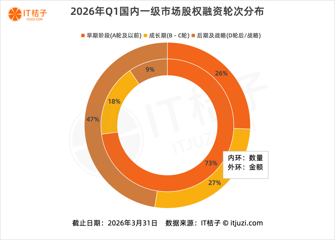 2026年一季度早期阶段占据72.8%的事件占比,但仅贡献25.7%的金额,这种“量大额小”的结构验证了市场的风险偏好正在修复——机构愿意在更早期的节点下注,以换取未来的超额收益。尤其是在AI与机器人赛道,天使轮项目占比显著高于历史均值,显示技术范式变革催生了大量新团队与新机会。