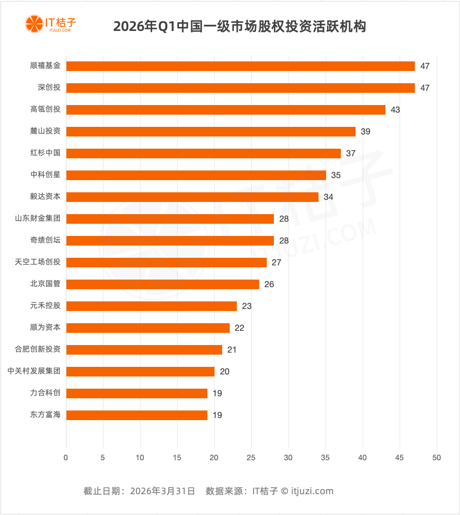 一季度TOP 20活跃投资方中,国资背景机构占据11席,与市场化机构形成均衡态势。深创投与顺禧基金均以47次出手并列第一,展现出国资VC在Q1的激进姿态,其投向集中于先进制造、半导体、新能源、智能机器人等“卡脖子”领域。
