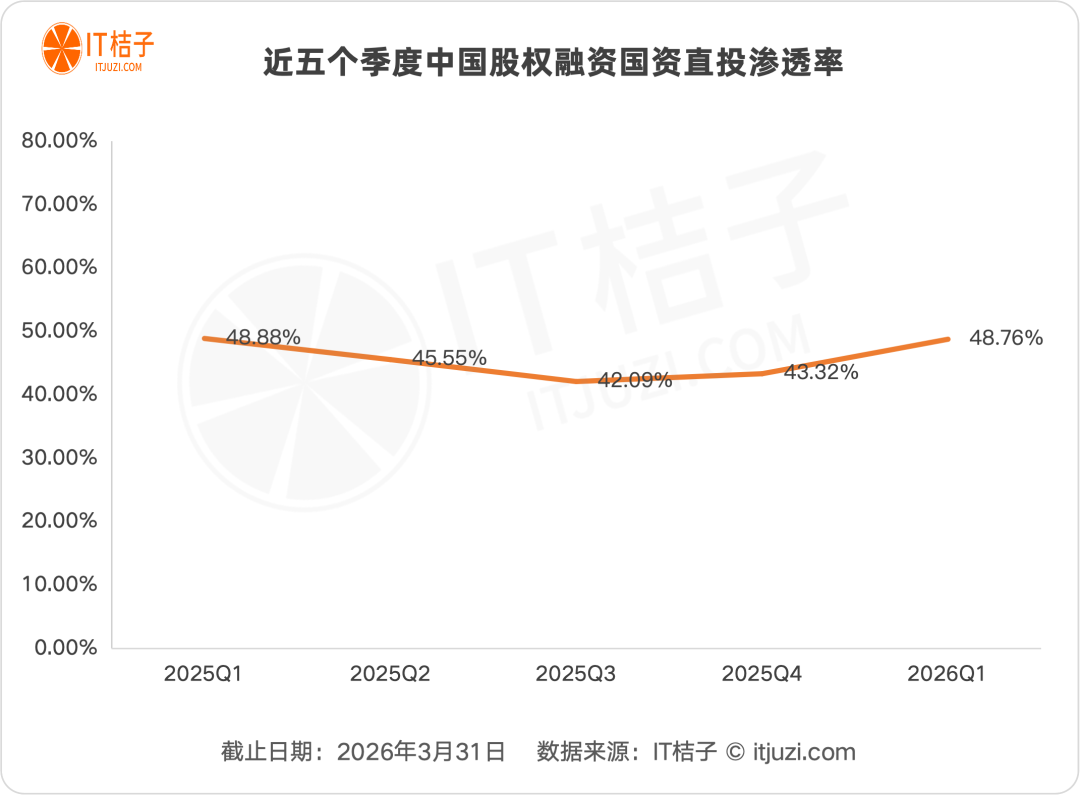 国资背景的参与呈现略微的“V型”走势。2025年Q1至Q3,国资占比从48.88%持续下降至42.09%,反映市场化力量的复苏;但2025年Q4开始回升,至2026年Q1达到48.76%,不仅较2025年Q4(43.32%)提升5.44个百分点,更超过了2025年同期水平。