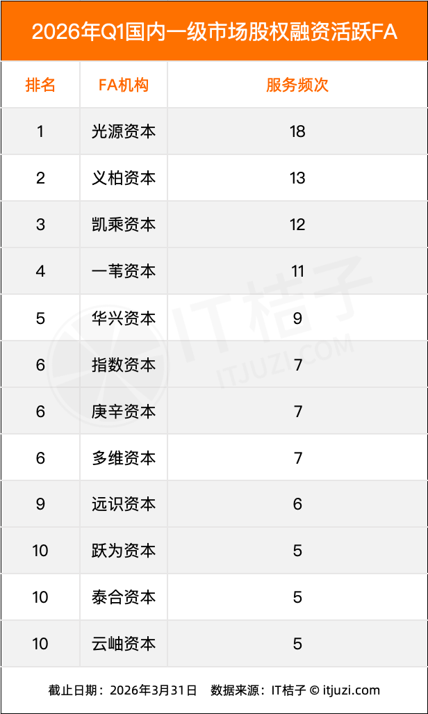 2026年一季度的股权投资交易中,光源资本以18次服务稳居榜首,且在超大额交易中优势显著(银河通用机器人新一轮25 亿元、爱诗科技 C 轮 3 亿美元等),体现其在AI、机器人、新能源领域的深度布局。