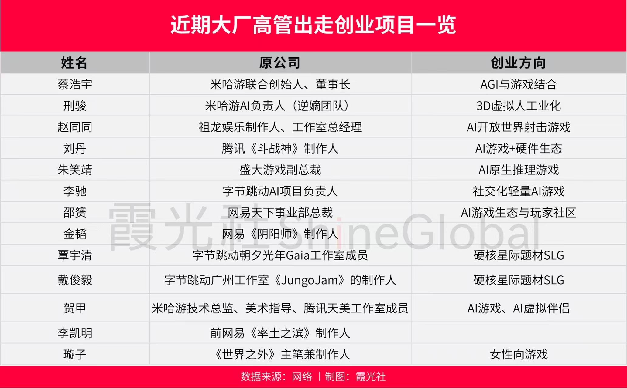 在他们之前,网易海外投资负责人朱原、原网易游戏旗下天下事业部总裁少云、《阴阳师》制作人兼前Zen事业部负责人金韬也都相继离开。