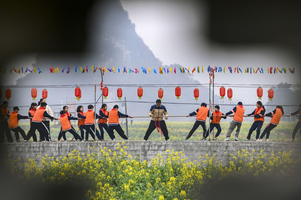 在广西兴业县葵阳镇一处油菜花田边,泉江小学的学生们在进行拔河比赛。新华社记者 曹祎铭 摄
