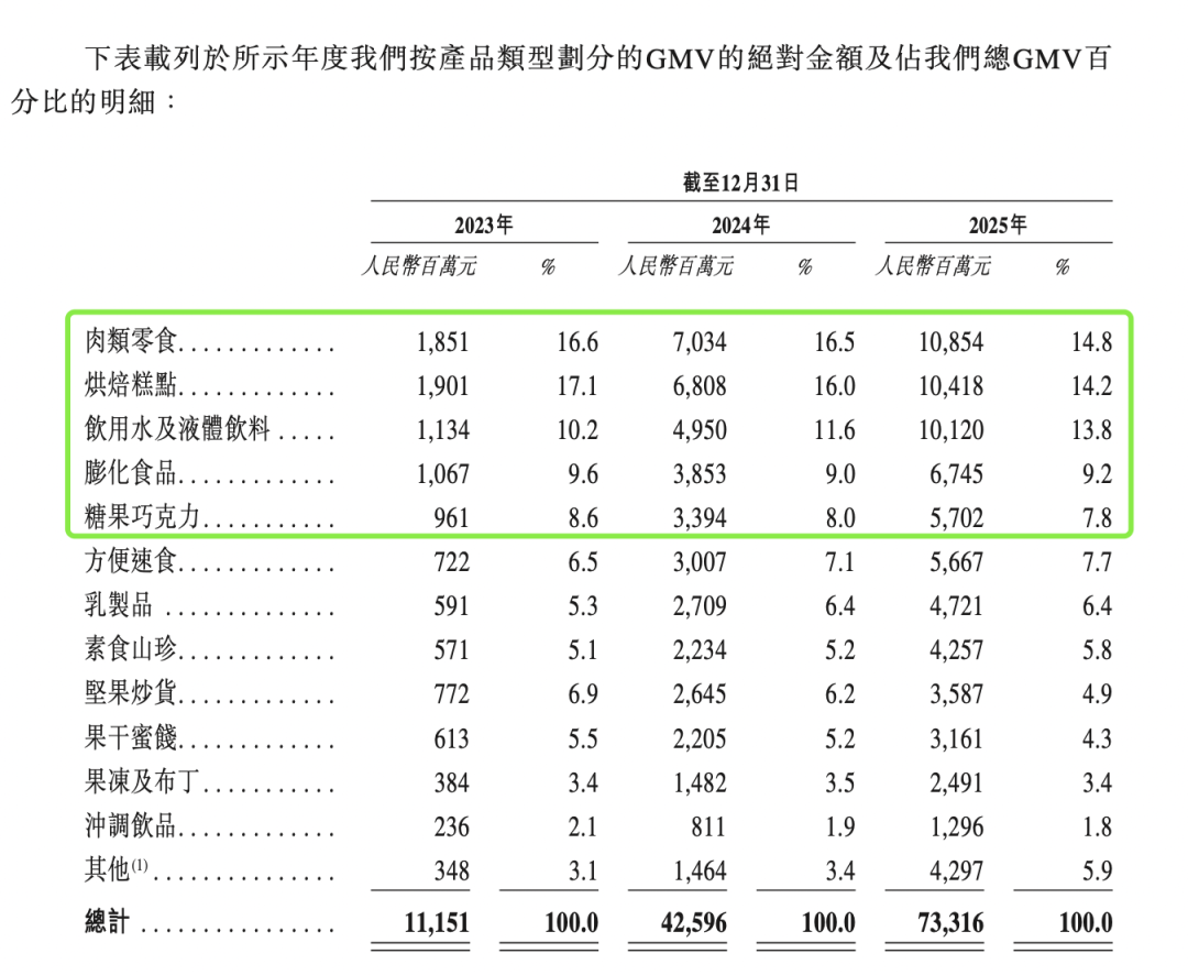 此次万辰更新的招股书也显示,肉类零食、烘焙糕点、饮用水及液体饮料、膨化食品、糖果巧克力五大品类,在过去3年的GMV金额中,占比均超过50%。