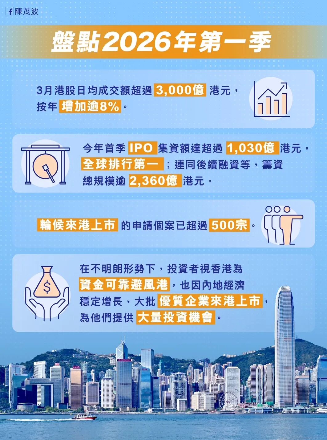 陈茂波在网志中指出,受外部因素拖累,香港股市出现回调,恒生指数今年来下跌约2%,但交易依然活跃,首两月日均成交额超过2600亿港元,按年上升17%。进入3月,市况更为活跃,港股日均成交额超过3000亿港元,较去年同期增长逾8%。这反映出在不明朗的全球形势下,投资者将香港视为可靠的资金避风港,同时内地经济稳定增长也为市场提供了大量投资机会。