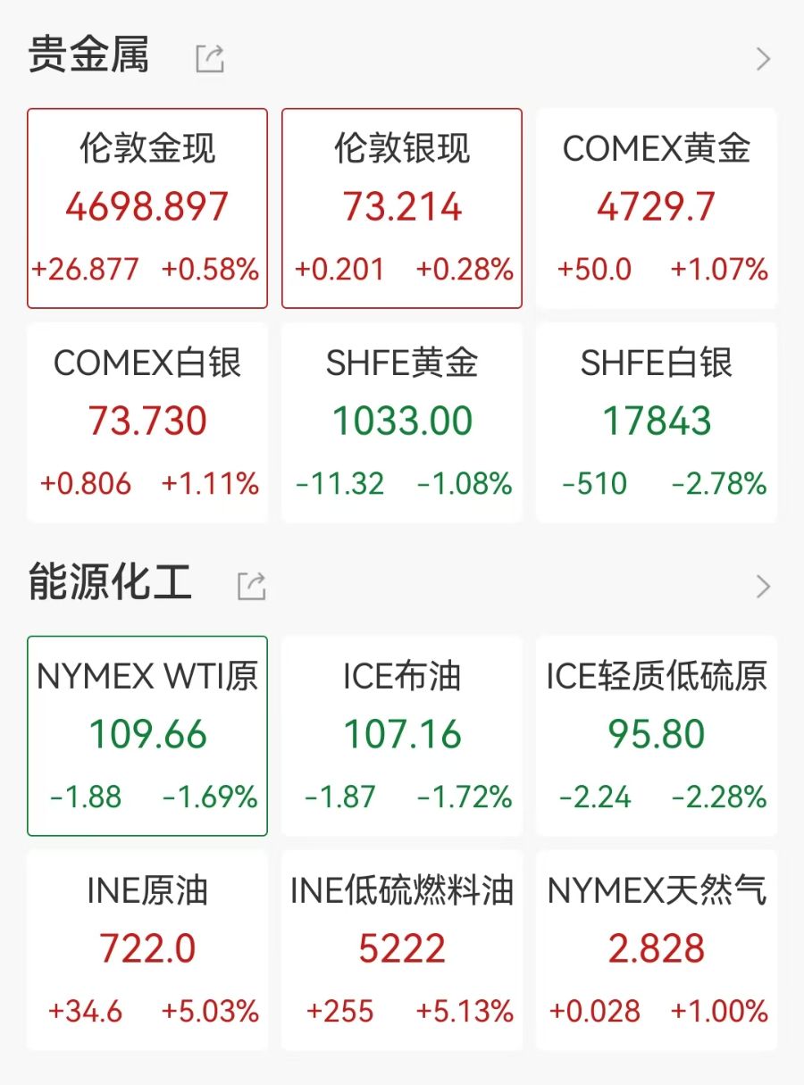 截至北京时间4月6日17:50,WTI原油期货跌1.69%,报109.66美元/桶;ICE布油期货跌1.72%,报107.16美元/桶。早间,WTI原油期货一度大涨超3%。