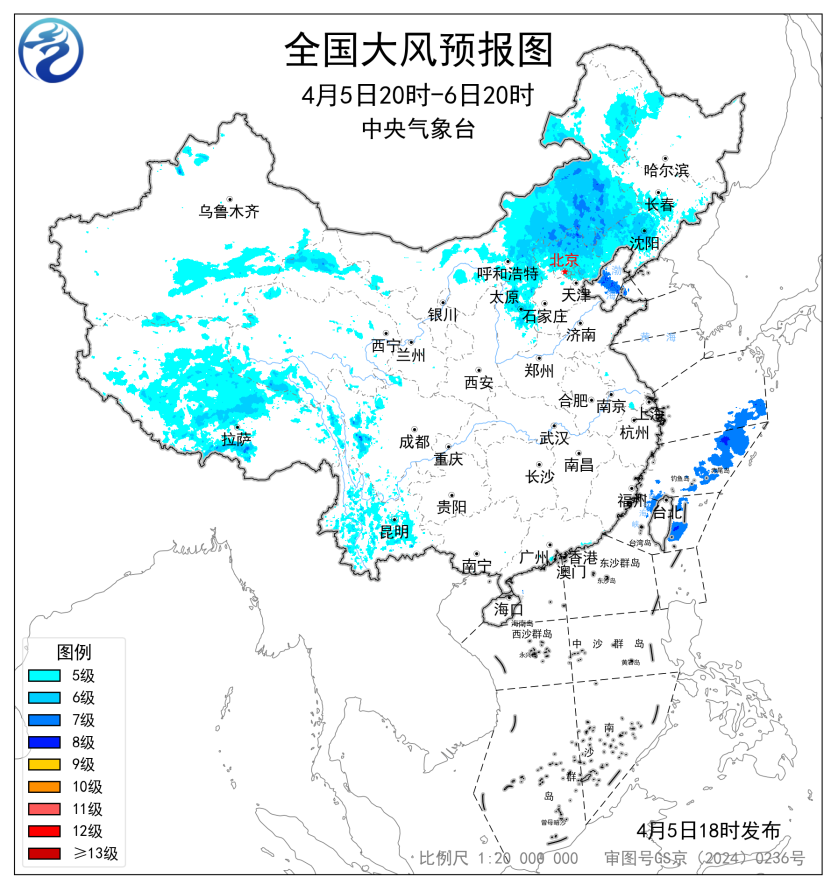 ■ 中央气象台5日发布大风蓝色预警:5日20时至6日20时,内蒙古中东部、华北北部和西部、辽宁大部、吉林东部以及新疆南疆盆地、甘肃西部、川西高原北部、西藏中西部、云南等地部分地区有5~7级风,阵风7~9级,局地阵风10级以上。