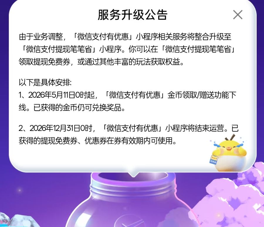 近日,“微信支付有优惠”小程序发布服务升级公告:该小程序将于2026年12月31日结束运营,相关服务将整合升级至“微信支付提现笔笔省”小程序。5月1日起金币领赠功能下线,但已获得的金币仍可兑换奖品,已获得的提现免费券、优惠券在券有效期内可使用。