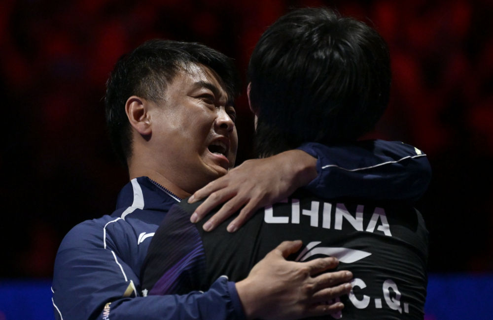 夺冠后,王楚钦躺倒在地,起身后拥抱了教练,并指了指背后球衣上的“CHINA(中国)”。