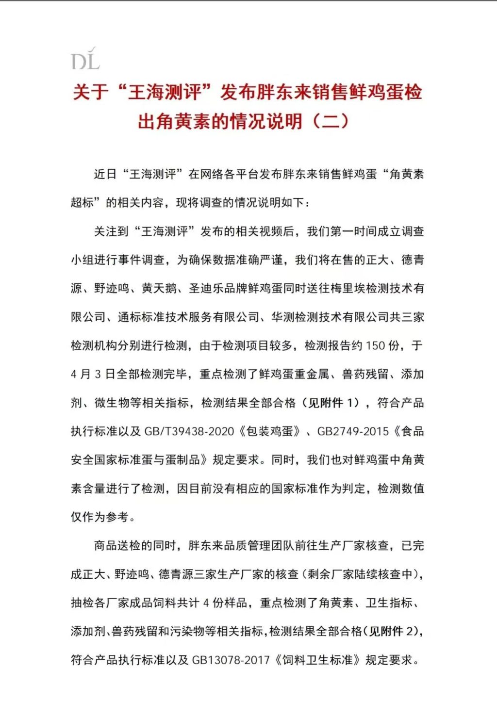 说明称,在关注到“王海测评”相关视频后,已第一时间成立调查小组。为确保严谨,他们将在售的多个品牌鲜鸡蛋送往三家权威检测机构进行检测,约150份检测报告显示,所有样品的重金属、兽药残留、添加剂、微生物等指标均合格,符合国家相关标准。同时,对鲜鸡蛋中角黄素的检测数值,因无国家标准,仅作为参考。