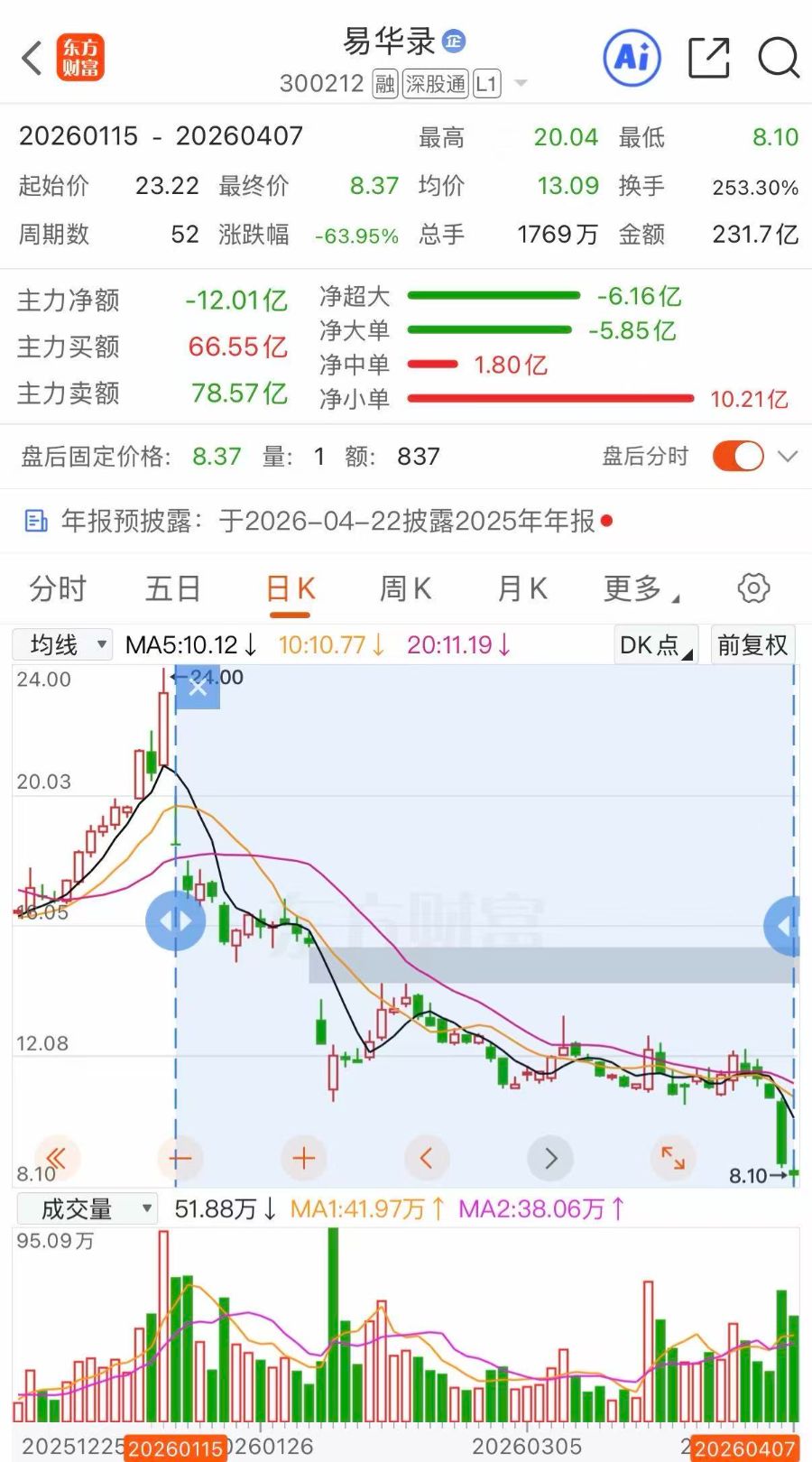 4月7日,易华录(300212.SZ)股价持续走低,截至收盘,股价报8.37元,再创上市以来新低,继上一交易日放量大跌18.81%后,跌幅4.01%,而4月份以来4个交易日累计跌幅超过26%。