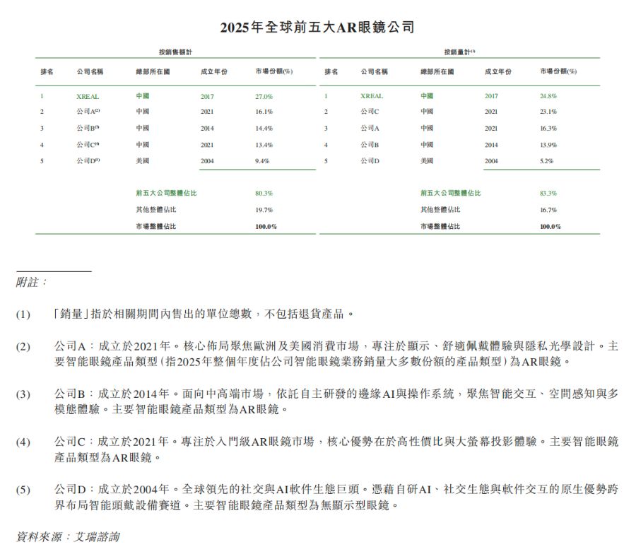根据招股书附注,排名第二的公司成立于2021年,专注欧洲及美国市场,推测可能为Viture;排名第三的公司成立于2014年,自研操作系统等,可能为Rokid;排名第四的公司成立于2021年,主打入门级高性价比产品,可能为雷鸟创新;排名第五的美国公司成立于2004年,是全球领先的AI软件生态巨头,可能为Meta。