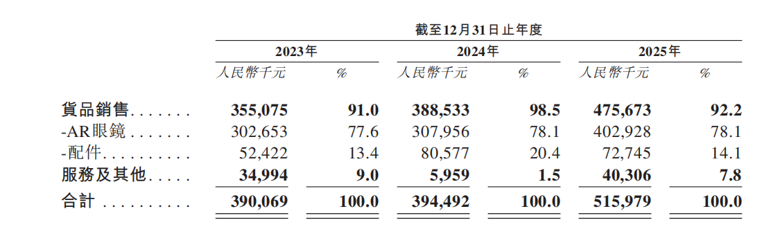 XREAL的收入来自AR眼镜销售、配件销售和技术服务,其中公司九成以上的收入都来自AR眼镜的销售。2025年,公司总营业收入5.16元,其中AR眼镜销售收入4.03亿元。