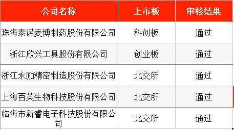 其中,拟在科创板上市的珠海泰诺麦博制药股份有限公司(下称“泰诺麦博”),拟在创业板上市的浙江欣兴工具股份有限公司(下称“欣兴工具”),以及拟在北交所上市的浙江永励精密制造股份有限公司(下称“永励精密”)、上海百英生物科技股份有限公司(下称“百英生物”)、临海市新睿电子科技股份有限公司(下称“新睿电子”)等均成功过会。