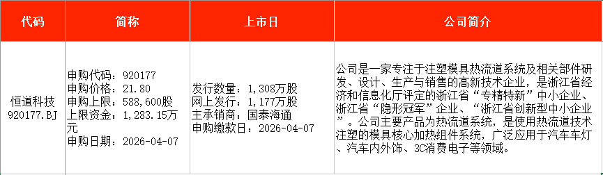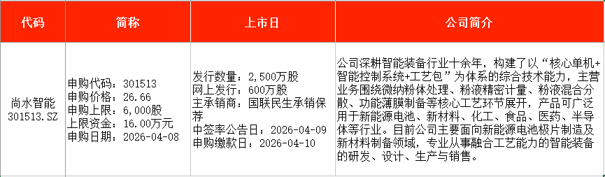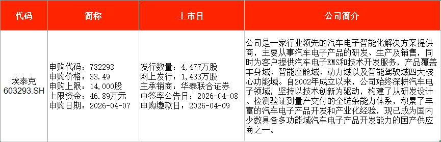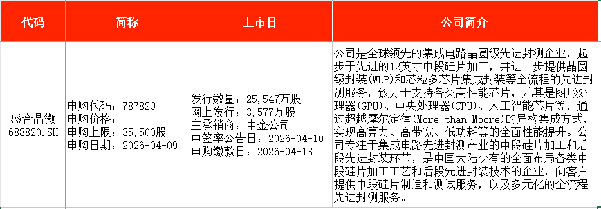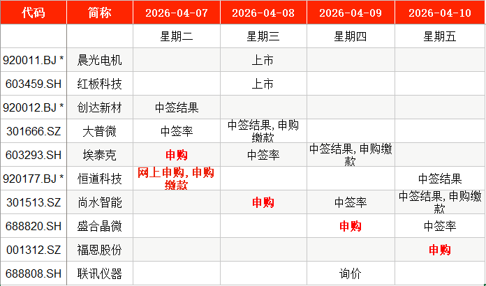 从时间表看,埃泰克(603293)、恒道科技(920177)在本周二(4月7日)申购,尚水智能(301513)将在本周三(4月8日)申购,盛合晶微(688820)将在本周四(4月9日)申购,福恩股份(001312)则在本周五(4月10日)申购。