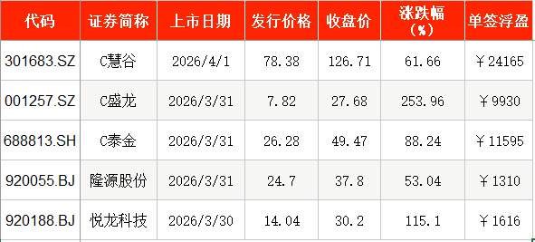 3月31日,慧谷新材(301683)在创业板挂牌上市,发行价为78.38元/股,截至上市首日收盘,该股报126.71元/股,涨幅为61.66%。以收盘价计算,投资者中一签浮盈为2.42万元。