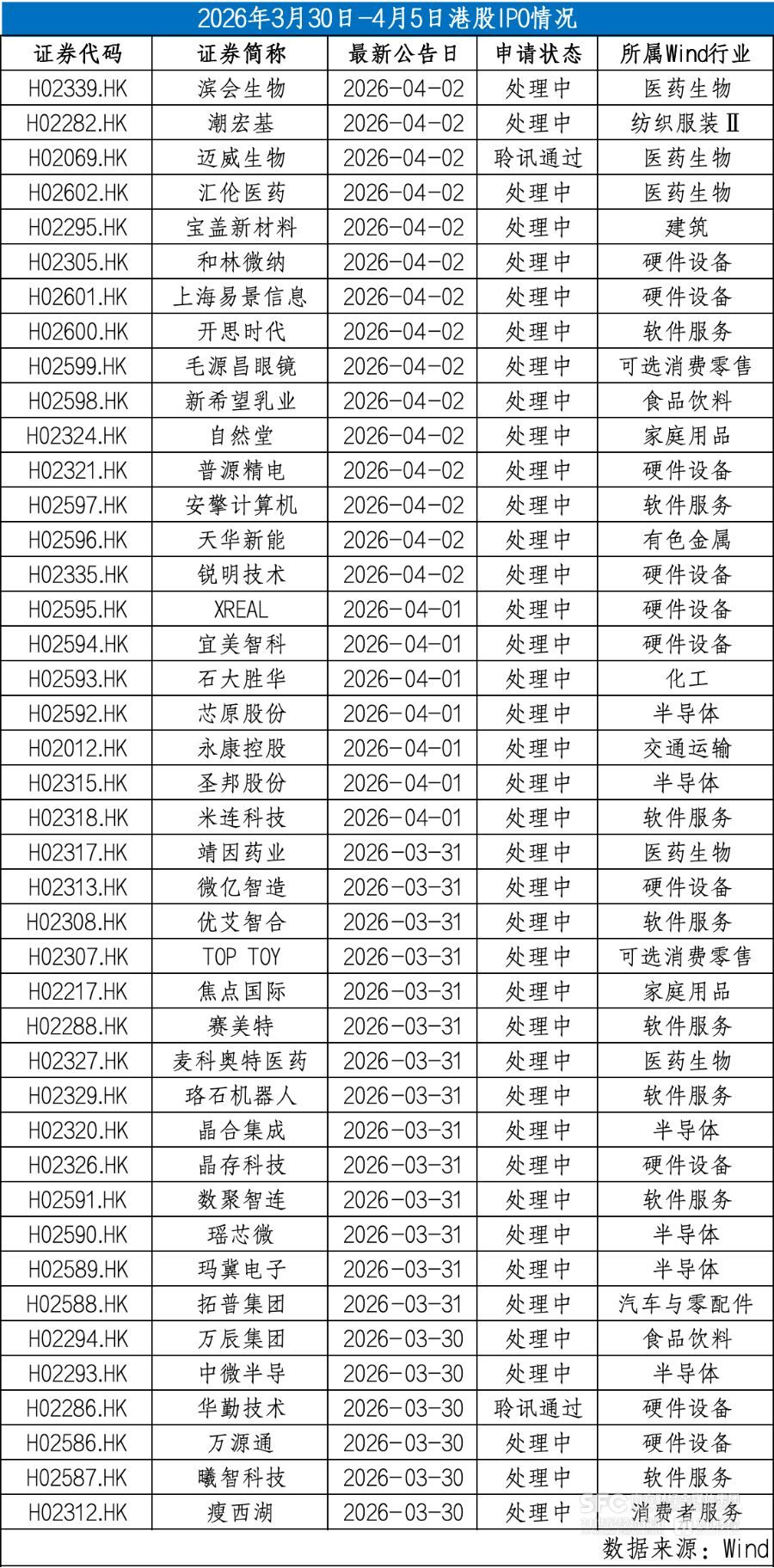 据Wind数据,当周(3月30日-4月5日)有40家公司向港交所递表,2家公司通过聆讯。另有6只新股上市。