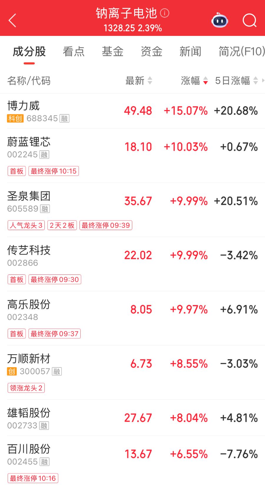 4月7日,钠离子电池板块大爆发,博力威涨超15%领涨,蔚蓝锂芯10分钟直线拉涨停,圣泉集团、传艺科技、高乐股份涨停,万顺新材、雄韬股份、百川股份等多只概念股跟涨。