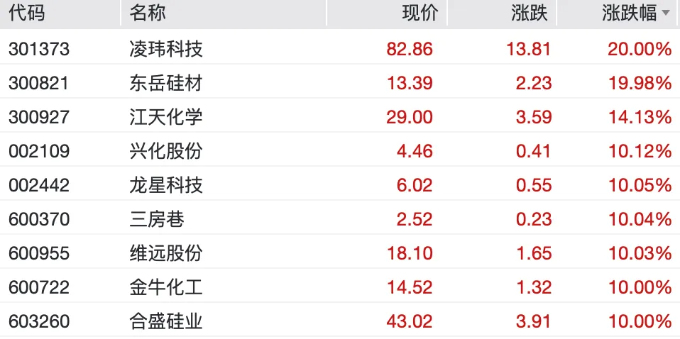 从板块来看,化工板块全线大涨,多股涨停。其中东岳硅材开盘1分钟20cm涨停,随后同宇新材、凌玮科技同样20cm涨停,金牛化工、新安股份、尤夫股份、恒逸石化等多股涨停,13只股票涨幅超过10%。