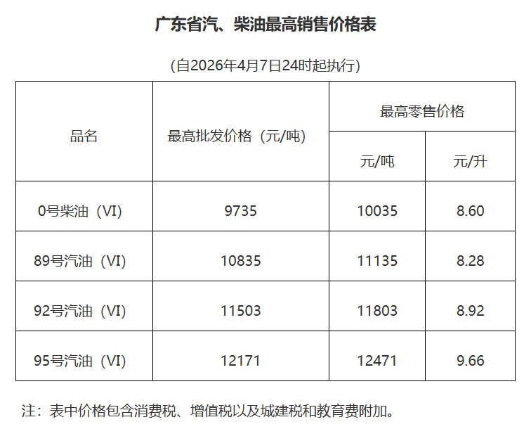 据此前消息,自3月23日24时起,广东省成品油最高销售价格为: 0号柴油最高8.26元/升,89号汽油最高7.97元/升,92号汽油最高8.58元/升,95号汽油最高9.30元/升 。