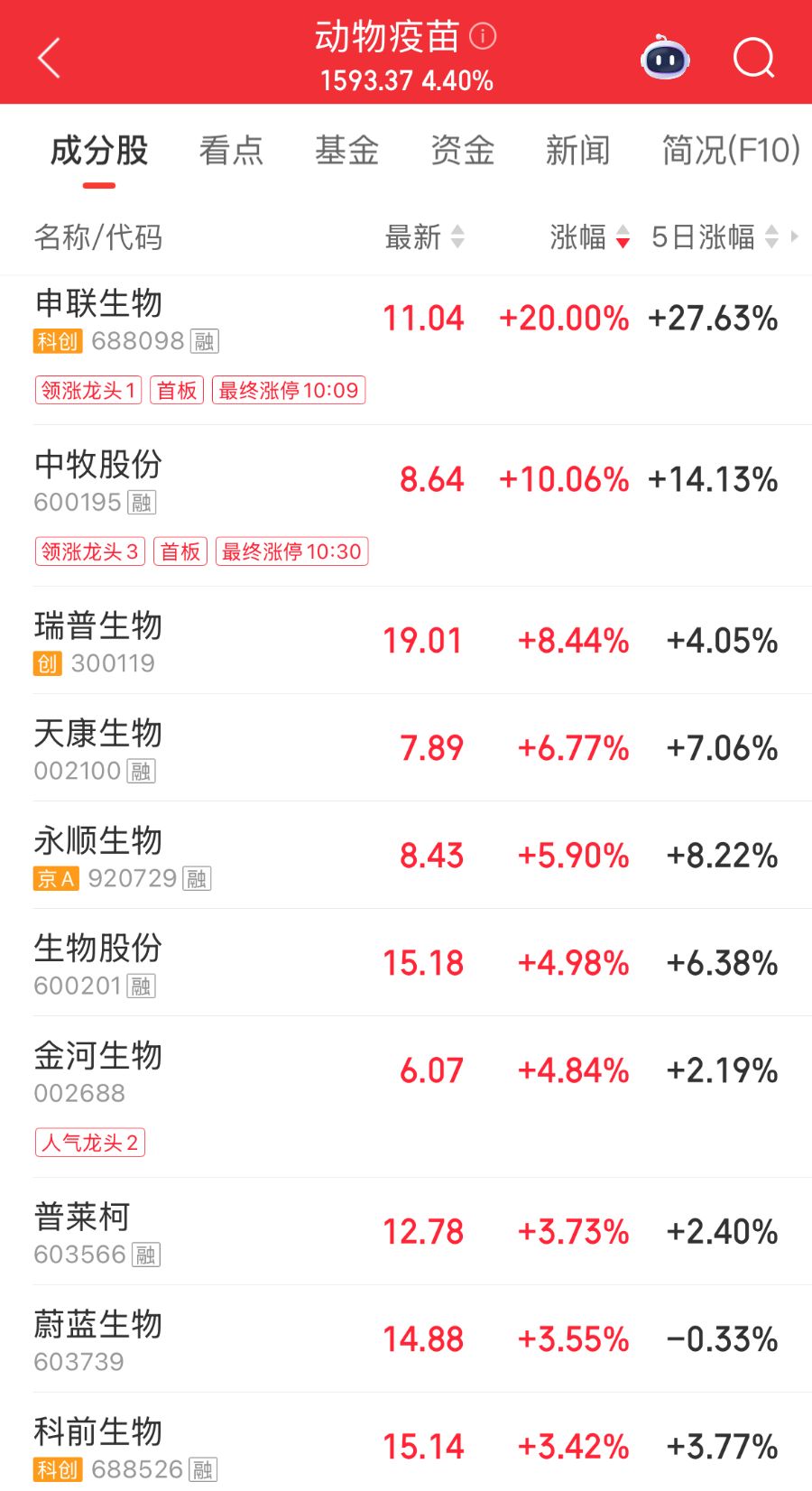 4月7日,动物疫苗概念大幅走强。截至午间收盘,申联生物20cm涨停,中牧股份10cm涨停,瑞普生物、天康生物、永顺生物等多只概念股跟涨。