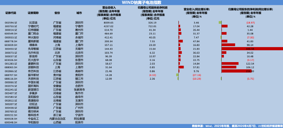 以钠离子电池指数(8841440.WI)为例,A股目前有相关上市公司28家,截至4月7日,已有16家披露了2025年年报,仅有1家亏损,绝大多数公司都实现了不错的业绩。
